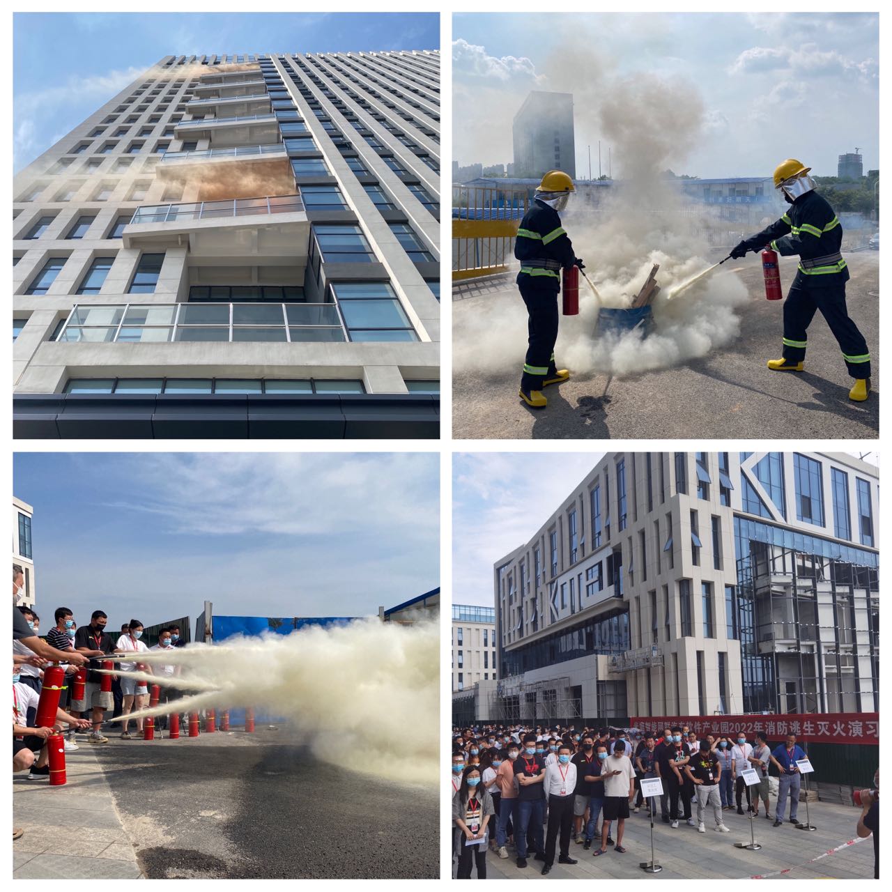 下午3:05分,随着模拟“火情”发生,消防警报立即拉响,应急领导小组和各应急救援组立即到达指定位置,后勤保障组迅速拉好警戒线,关闭电梯,控制人员进入,疏散救援组立即上楼组织员工有序疏散,灭火救援组穿好阻燃救援服进行灭火操作。人员全部疏散至安全地带后,物业公司专业消防人员现场对全体参加演习的员工进行消防知识、消防器材的使用培训、初期火灾扑救等培训。整个过程人员配合默契、处置迅速、撤离有序,达到了演练的预期效果。