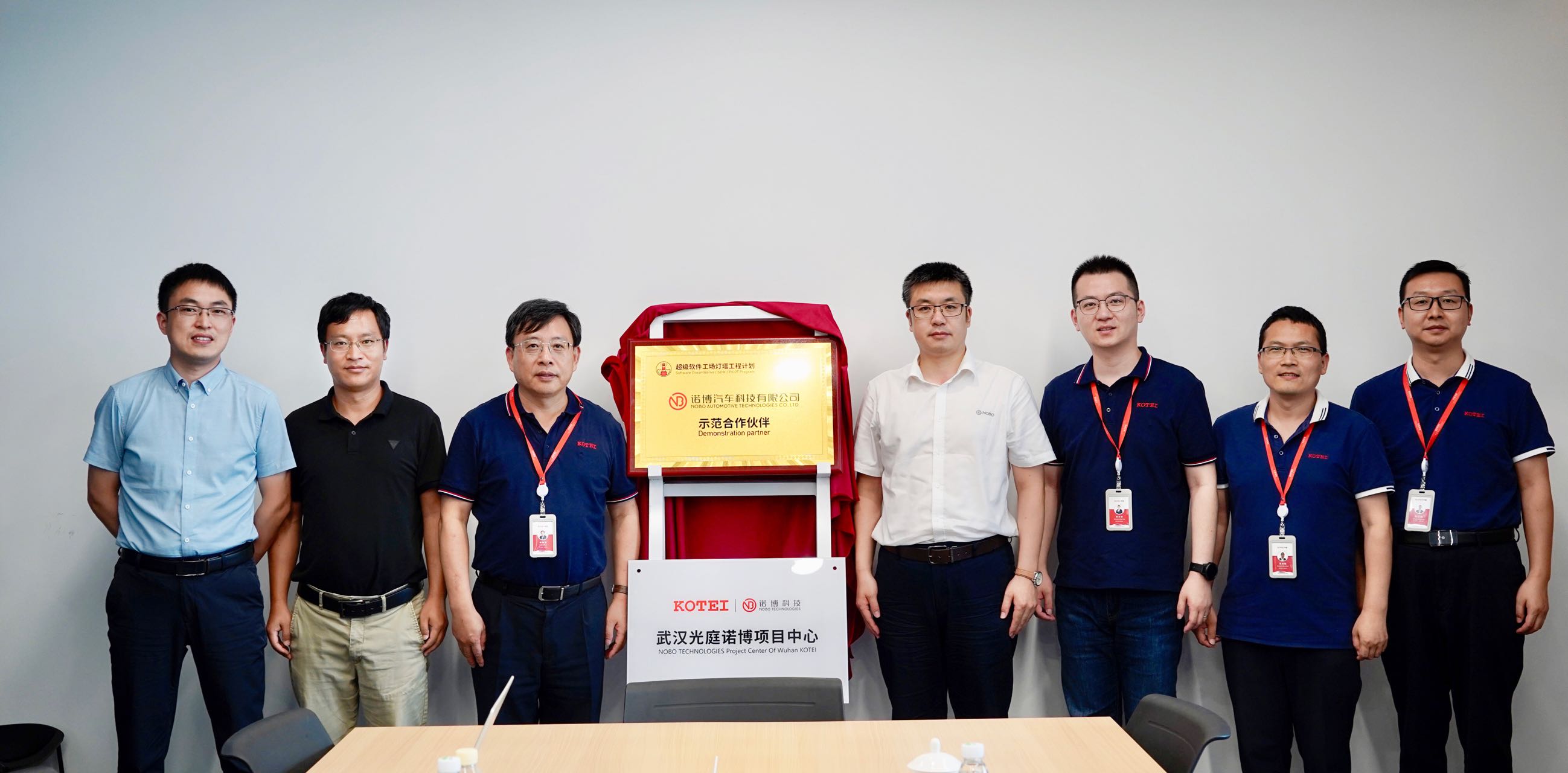 诺博汽车副总裁乔宪光和光庭信息董事长朱敦尧代表企业双方为“超级软件工场-灯塔工程示范合作伙伴”揭牌。