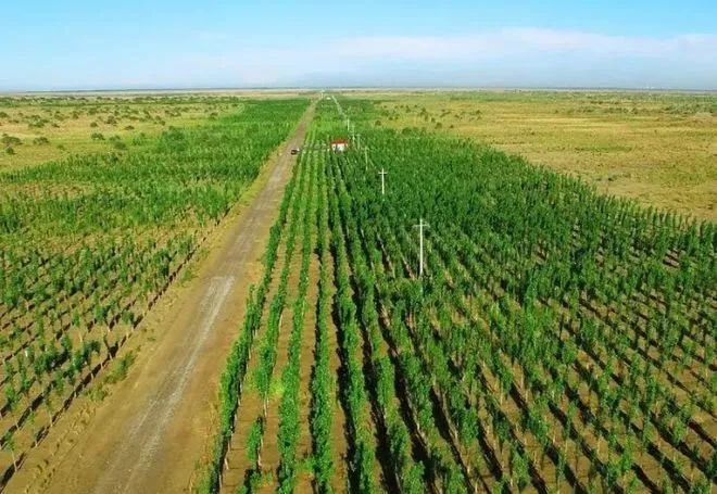 新疆塔里木盆地中心是一片浩瀚黄沙,它是中国最大沙漠、世界第二大流动沙漠——塔克拉玛干沙漠。风卷细沙向四周蔓延,翻滚至沙漠西南部,一道绿色生态屏障将其阻拦。这便是新疆喀什地区麦盖提县实施的“百万亩防风固沙生态林工程”。