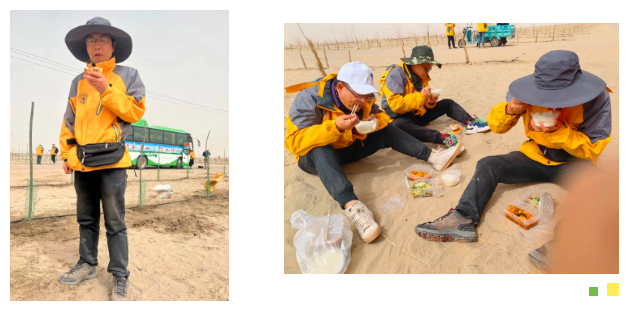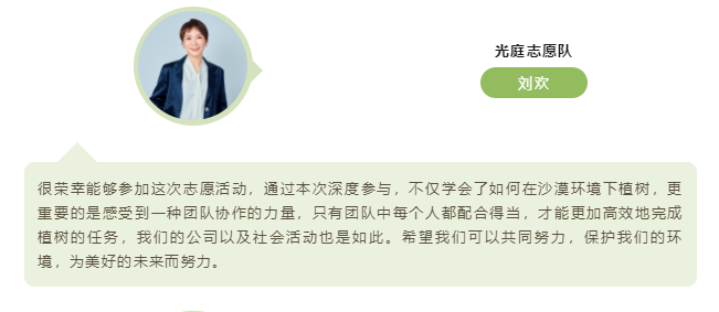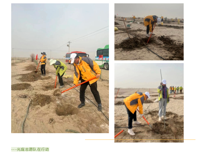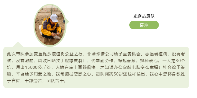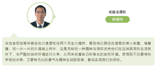 除了种树难度,当地恶劣的工作环境更是对每一位植树人来讲都是一种考验。“风里裹着沙子,直钻眼窝;被滴灌过的湿沙非常重,高温暴晒下作业难度直线升级;干粮拿出来就沾上沙,也就只能就着沙子下咽了”。采访光庭志愿者时,虽然事后说起来轻松,但是从最开始的人均一天只能种七棵树,到后面一天种植30棵,让我们看到光庭人“吃苦耐劳、高效务实”的奋斗精神。