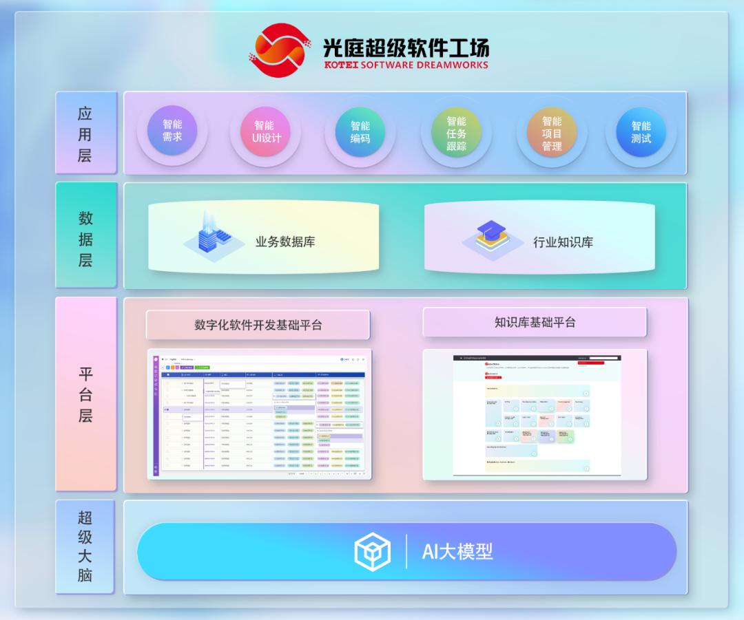 光庭信息超级软件工场,基于AI大模型作为智能底座,围绕数字化、知识化构建软件开发平台的基础, 结合业务数据和行业知识库,实现超级大脑,面向业务场景定制智能化应用,最终实现AI驱动,人机协同的软件开发流程。