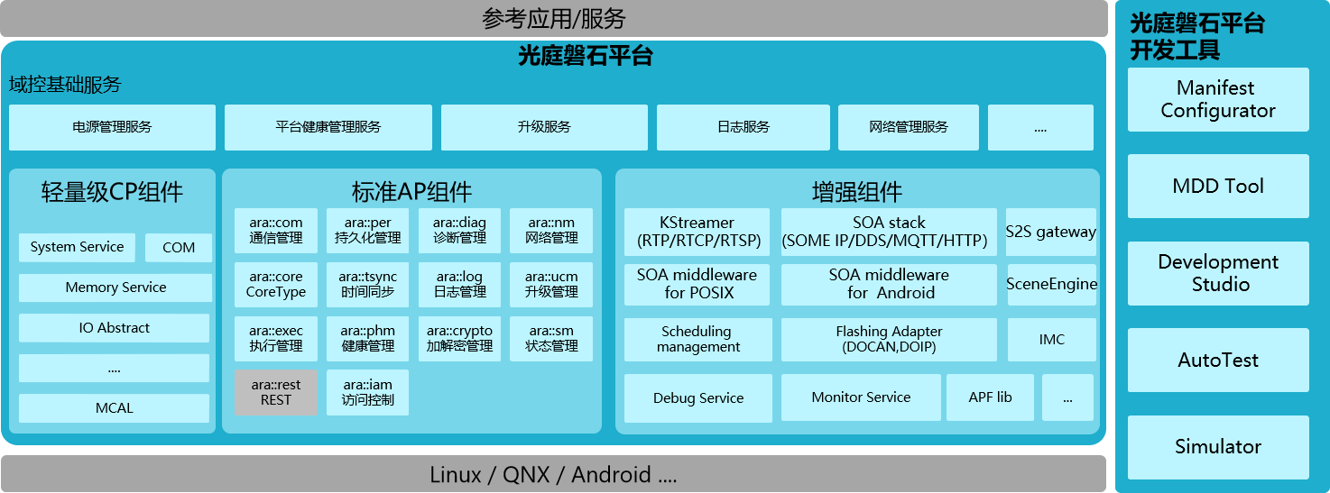 伴随着SOA架构理念的兴起,光庭全栈自研了AP AUTOSAR,并以之为基础,推出了光庭磐石软件平台。磐石平台包括4大部分,分别为轻量级CP组件,标准AP组件,扩展AP组件和磐石工具链。其中,磐石工具链就是为提升SOA研发效率特意打造的。磐石工具链可服务于SOA架构的研发全流程,从服务的设计,代码的生成,部署到最后的测试,形成全链条的闭环。支持多域高效研发,满足不断演进的汽车软件功能开发需求,支撑高度定制化、个性化智能场景的快速发布,有效提升研发效率。