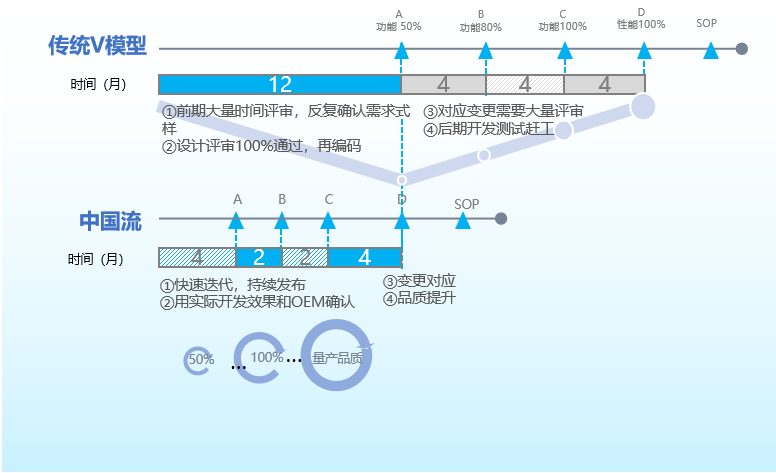 在中国流的实践上,基于客户需求共创软件开发流程。相比传统“V”开发流程,中国流重视在需求开发阶段就做快速迭代和最小原型验证,有效避免了后期的大量返工并兼顾质量和效率两大指标。经过项目度量数据分析,可实现节约研发成本30%,缩短工期50%的有益效果。该创新成果获得一向注重品质的TIER1电装公司的高度认可。