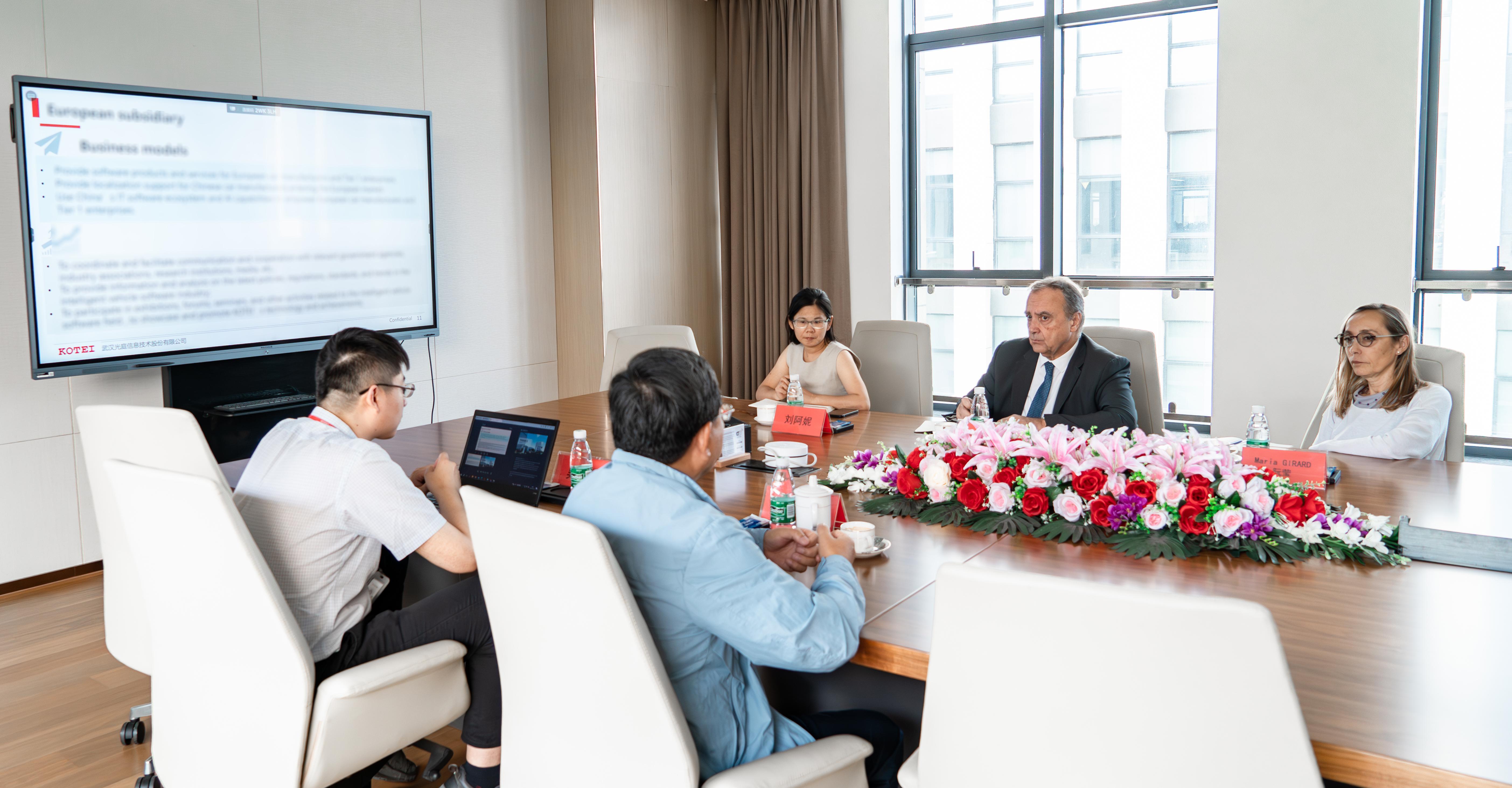 8月8日下午,法国驻武汉总领事胡建谊(Jean-Yves ROUX)一行莅临光庭信息考察指导,深入了解光庭信息发展历史和经营成就,并与光庭信息董事长朱敦尧开展交流座谈。