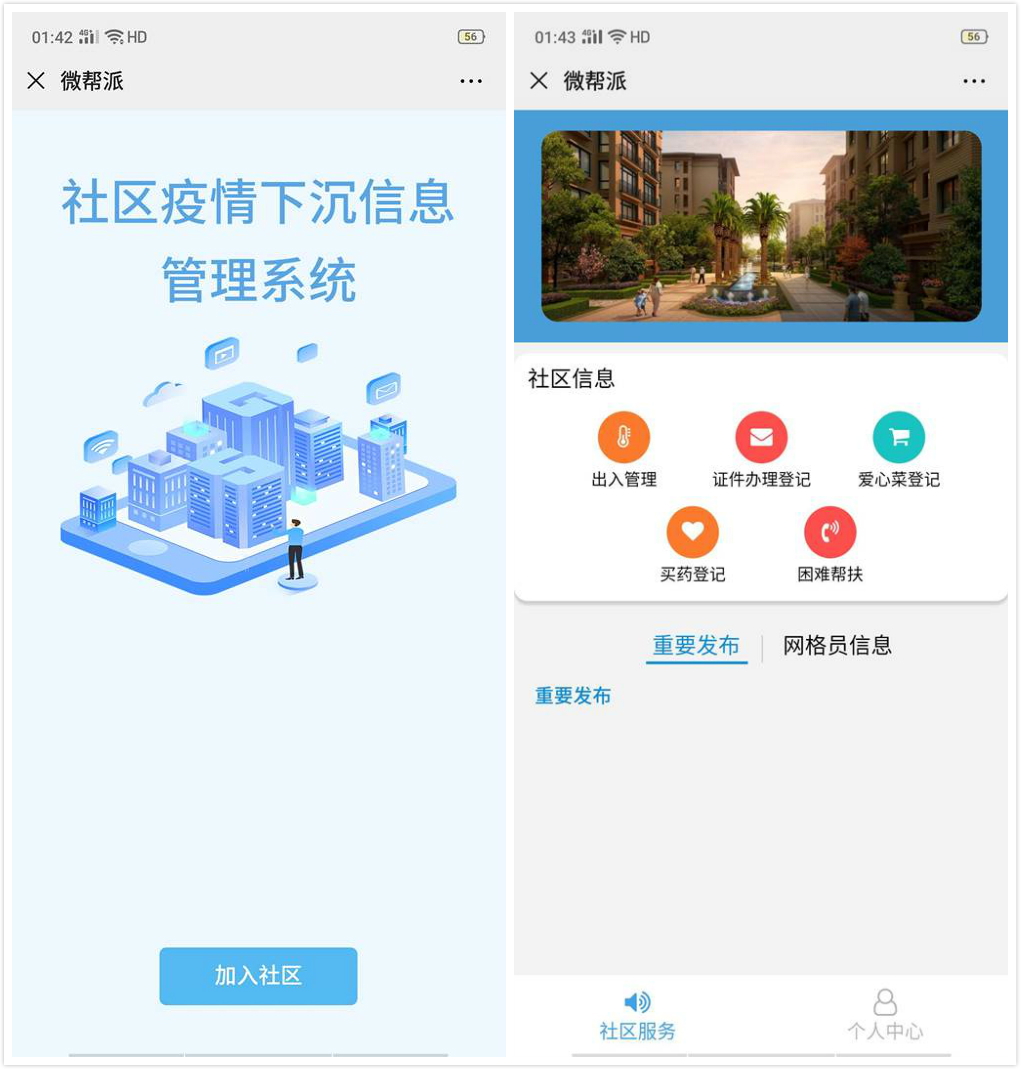 微帮派社区帮扶小助手将结合民政部及疫情防控新政策,不断扩展全新功能,升级为社区智能联控平台,支持疫情结束后社区智能化管理。