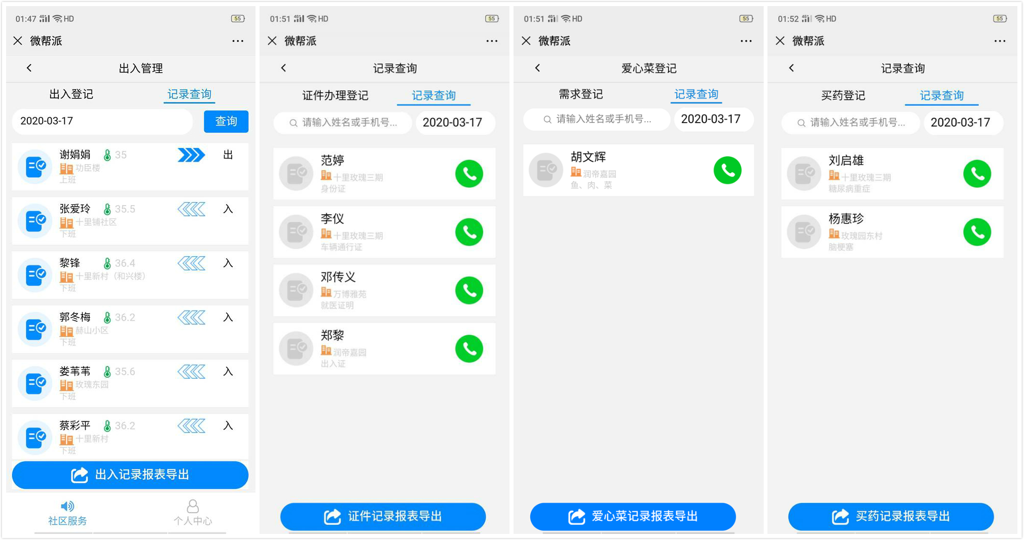 微帮派社区防控帮扶小助手依托光庭公司雄厚的平台开发能力,从当前社区进出数据分散、卡口值守登记“共用一支笔、共填一张表”等疫情防控痛点出发,将出入值守、爱心菜需求、居民买药以及外出证明登记等工作从“线下”变成“线上”、“跑社区”变成“来卡口”,并支持多人同时在线登记和查询,集动态、高效、精确、扁平化数据共享于一身,实现社区疫情防控移动化、智能化、数字化,并解决无意识的接触风险。