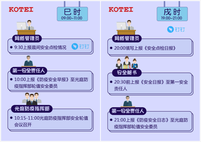 复工之后,将进一步落实每日疫情“早晚两汇报”,各事业部第一安全责任人于10:00、21:00上报《防疫安全早报》、《防疫安全日报》至指挥部。指挥部掌握全员信息后,召开当天轮值安全会议,部署重点工作。