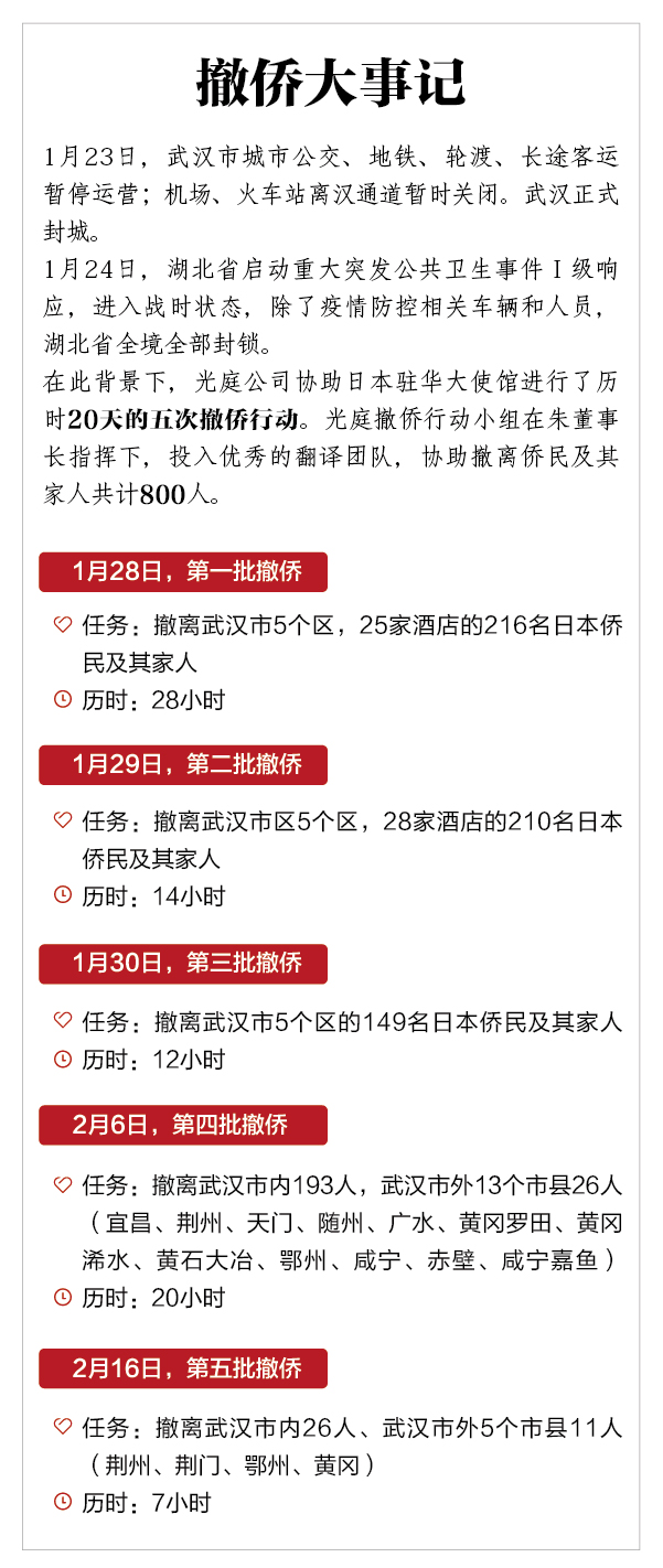 在这场撤侨行动中,光庭公司组织翻译团队,承担沟通协调工作,组织人员协调征集车辆。疫情期间,交通封闭,再加上春节期间,车辆、司机严重不足,当车辆协调陷入困境时,光庭人更是主动提出愿意自驾运送侨民及其家人前往机场。光庭人在这次行动中所展现出的集体主义精神、协调能力、奉献精神令人感动、敬佩。