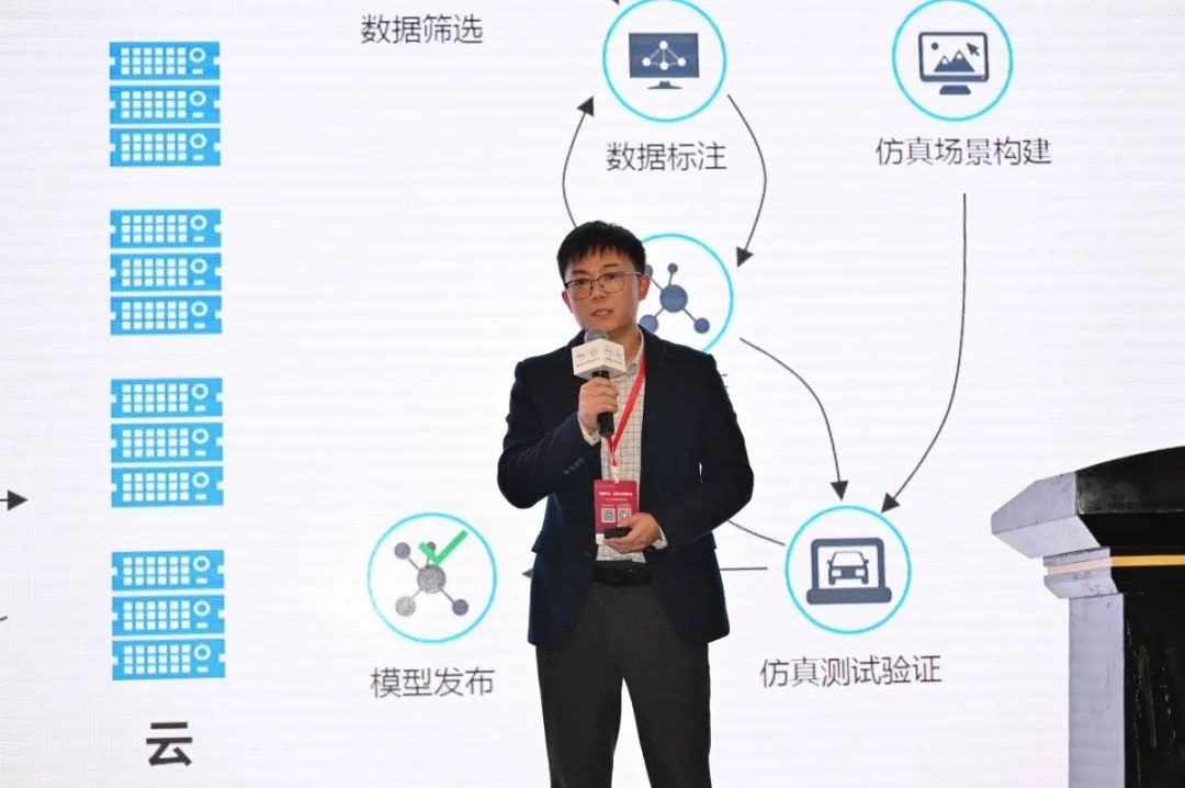 现场,郝江波还进一步分享了光庭信息多年来在数据驱动开发中的探索与实践。光庭信息在智能网联领域深耕多年,可提供全栈式智能网联解决方案,为客户构建自动驾驶产品研发和测试闭环。目前公司可基于数据+算法驱动的新型平台化开发能力,提供集数据采集、数据处理、数据标注、场景构建、AI训练、模拟仿真于一体的技术建设。