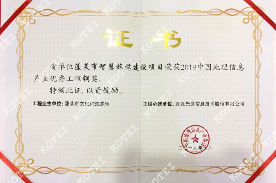 此次2019中国地理信息产业大会上光庭公司的“蓬莱市智慧旅游建设项目”成功入选中国地理信息产业优秀工程铜奖,“中国地理信息产业优秀工程奖”是由中国地理信息产业协会组织开展评选和实施颁布,旨在表彰具有广泛社会应用价值的优秀工程项目。
